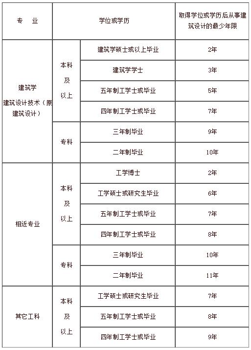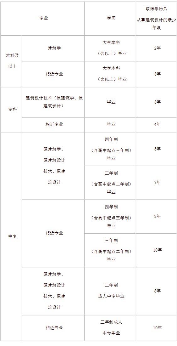 注:(1)根据《中华人民共和国注册建筑师条例实施细则》(中华人民共和国建设部令第167号)、《普通高等学校本科专业目录》(1998年版、2012年版)、《普通高等学校高职高专教育指导性专业目录》(2004年版)、《中等职业学校专业目录》(2010年版)等相关规定,“相近专业”:本科及以上为城乡规划(原城市规划)、土木工程(原建筑工程、原工业与民用建筑工程)、风景园林、环境设计(原环境艺术、原环境艺术设计);专科为城镇规划(原城乡规划)、建筑工程技术(原房屋建筑工程)、园林工程技术(原风景园林)、建筑装饰工程技术(原建筑装饰技术)、环境艺术设计(原环境艺术);中专为建筑装饰、建筑工程施工(原工业与民用建筑)、城镇建设、古建筑修缮与仿建(原古建筑营造与修缮)。